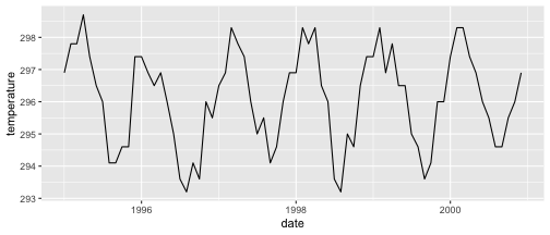class: center, middle, inverse, title-slide .title[ # Visualizing time ] .author[ ### DS 2020 ] --- # NASA data - `nasa` is a data set in the `GGally` package - it consists of atmospheric measurements across a grid of locations in Middle America ```r data(nasa, package="GGally") head(nasa) ``` ``` ## time y x lat long date cloudhigh cloudlow cloudmid ozone ## 1 1 1 1 -21.2 -113.8000 1995-01-01 0.5 31.0 2.0 260 ## 2 1 1 2 -21.2 -111.2957 1995-01-01 1.5 31.5 2.5 260 ## 3 1 1 3 -21.2 -108.7913 1995-01-01 1.5 32.5 3.5 260 ## 4 1 1 4 -21.2 -106.2870 1995-01-01 1.0 39.0 4.0 258 ## 5 1 1 5 -21.2 -103.7826 1995-01-01 0.5 48.0 4.5 258 ## 6 1 1 6 -21.2 -101.2783 1995-01-01 0.0 50.0 2.5 258 ## pressure surftemp temperature id day month year ## 1 1000 297.4 296.9 1-1 0 1 1995 ## 2 1000 297.4 296.5 2-1 0 1 1995 ## 3 1000 297.4 296.0 3-1 0 1 1995 ## 4 1000 296.9 296.5 4-1 0 1 1995 ## 5 1000 296.5 295.5 5-1 0 1 1995 ## 6 1000 296.5 295.0 6-1 0 1 1995 ``` --- # Quick overview ```r nasa %>% group_by(x, y) %>% tally() %>% head() ``` ``` ## # A tibble: 6 × 3 ## # Groups: x [1] ## x y n ## <int> <int> <int> ## 1 1 1 72 ## 2 1 2 72 ## 3 1 3 72 ## 4 1 4 72 ## 5 1 5 72 ## 6 1 6 72 ``` ```r nasa %>% ggplot(aes(x =x , y = y)) + geom_point() ``` <!-- --> --- # A date variable ```r str(nasa$date) ``` ``` ## POSIXct[1:41472], format: "1995-01-01" "1995-01-01" "1995-01-01" "1995-01-01" "1995-01-01" ... ``` ```r summary(nasa$date) ``` ``` ## Min. 1st Qu. Median ## "1995-01-01 00:00:00" "1996-06-23 12:00:00" "1997-12-16 12:00:00" ## Mean 3rd Qu. Max. ## "1997-12-15 22:40:00" "1999-06-08 12:00:00" "2000-12-01 00:00:00" ``` --- # Time series - for each observational unit we have multiple measurements: ```r nasa %>% filter(x == 1, y == 1) %>% ggplot(aes(x = date, y = temperature)) + geom_point() ``` <!-- --> --- # Time series (2) - for each observational unit we have multiple measurements, - which we connect by a line: ```r nasa %>% filter(x == 1, y == 1) %>% ggplot(aes(x = date, y = temperature)) + geom_line() ``` <!-- --> --- # Time series (3) - for each observational unit we have multiple measurements, - which we connect by a line. - Each observational unit forms a group, we only connect points within a group by a line. ```r nasa %>% filter(x == 1, y %in% c(1, 10)) %>% ggplot(aes(x = date, y = temperature, group=id)) + geom_line() ``` <!-- --> --- class: inverse # Your Turn (6 mins) - Load the `nasa` data from the package `GGally`, - for one location, draw a time line of Ozone over the time frame (`date`). - Plot separate lines for each of the years, i.e. put `month` on the x-axis and `ozone` on the y-axis for the same location. Is there a seasonal pattern apparent? - Pick a location with x in 1:10 and y in 7:10. Plot temperature over time. Comment on the result.